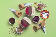 2 Pints handgestrichen (500ml) mit jeweils 3 Eiscremesorten nach Wahl + 4 Toppings nach Wahl + 4 Waffeln
